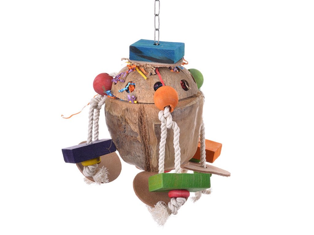 Hračka pro velké papoušky Coconut Fun II o rozměru 28 x 23 x 46 cm.