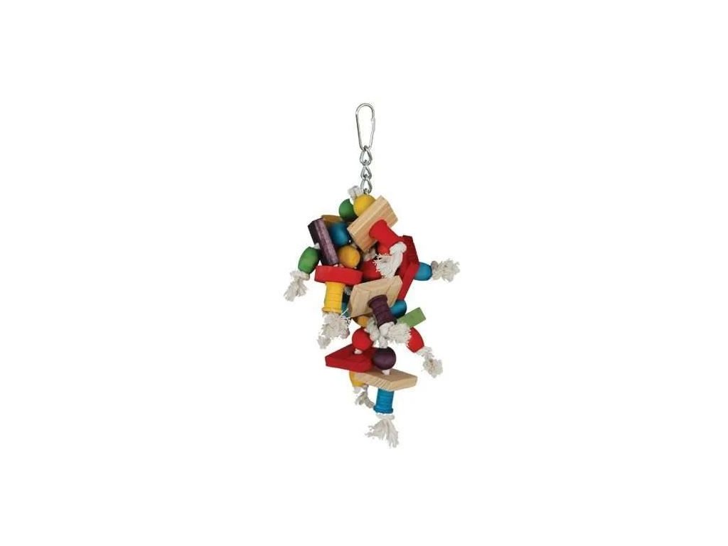 Oblíbená hračka pro papoušky vyrobená z přírodních materiálů. Barevné dřevěné prvky na přírodních bavlněných provázcích poskytnou vašemu opeřenému kamarádovi hodiny a hodiny zábavy. Dřevěné prvky jsou obarveny nezávadnými potravinářskými barvivy. Hračku lze snadno a bezpečně zavěsit pomocí karabiny.