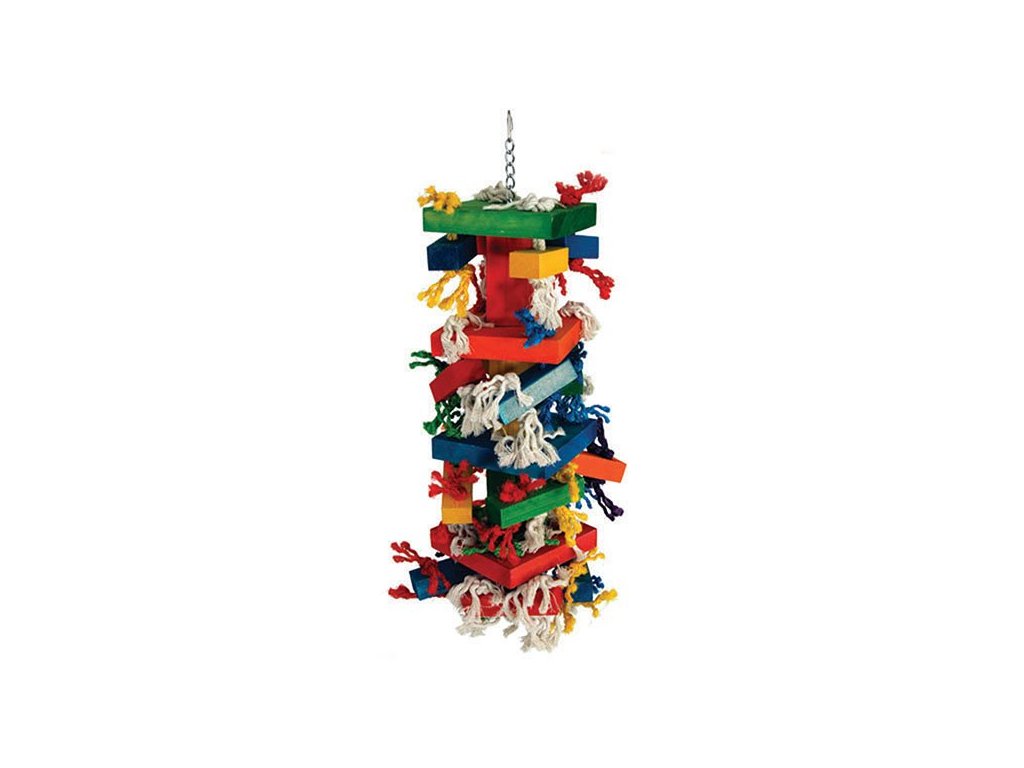 Skvělá hračka z dřevěných částí a bavlny, se kterou si váš papoušek užije spoustu zábavy. Dřevěné části jsou barveny potravinářským barvivem, takže jsou naprosto netoxické. Hračka je velká a robustní a je proto mimořádně vhodná pro kakadu, ary a jiné střední a velké opeřené ničitele.