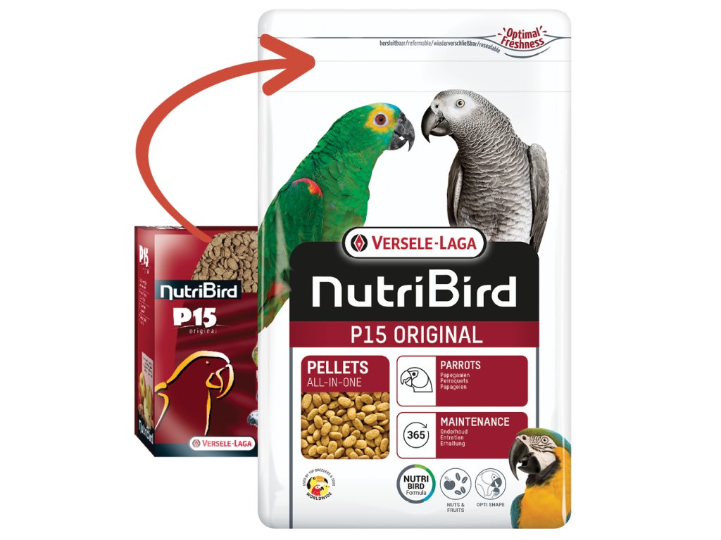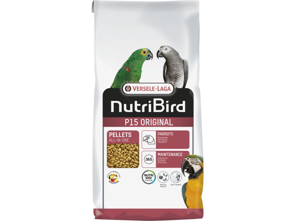 Krmivo NutriBird P15 Original pro velké papoušky na denní krmení v 10kg balení Bezbarevné granule pro velké papoušky. Pelety s vědecky schváleným složením, založené na vybraných druzích zrna, čerstvém ovoci a arašídech. Obsahuje složku Florastimul, která podporuje střevní flóru a chrání proti střevním onemocněním.