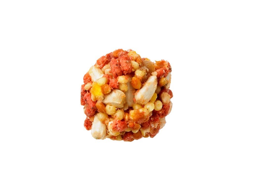 Složení: Kukuřice, loupané bílé proso, kardy, sójová moučka, červené proso, papája, maltodextrin, pšenice, arašídové granule, mango, ananas, řepkový olej, kukuřičný sirup, fosforečnan vápenatý, glycerol, mletý vápenec, želatina, kukuřičný lepek, vejce, jodizovaná sůl, DL-methionin, kyselina citrónová, směs tokoferolů (konzervant), , mangan, karoten, zinek, kalcium pantotenát, biotin, riboflavin, selen, pyridoxin, thiamin, vitamin B12, vitamin D3, přírodní barviva, kyselina listová, měď, lysin. N utričné hodnoty: Protein: 10%, Tuk: 6%, Vláknina: 5%, Vlhkost: 14%, Omega 3 mastné kyseliny: 0,31%, Omega 6 mastné kyseliny: 4,5%